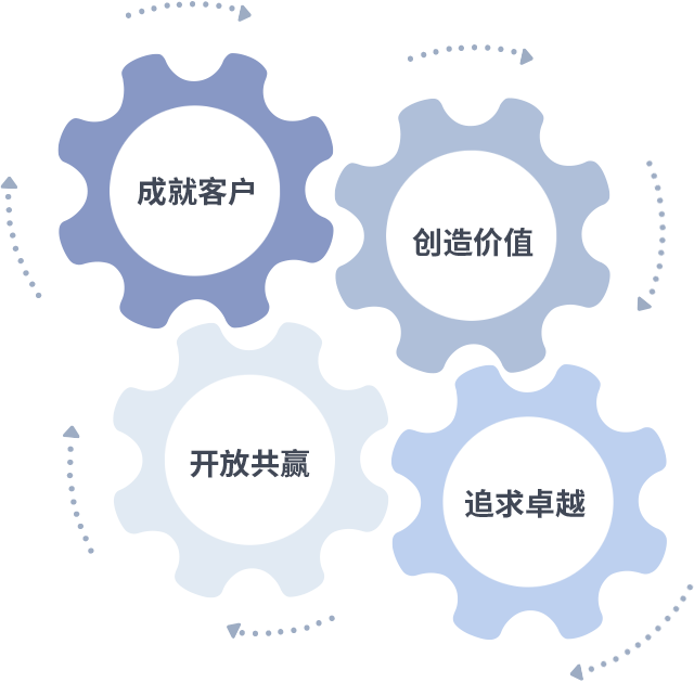 成就客户是一切决策的出发点,创造价值是衡量所有工作的标准,追求卓越是旺财28做事做人的态度,开放共赢是旺财28的格局也是最终的结果。价值观的齿轮环环相扣,推动着组织里的每个人不断向前。